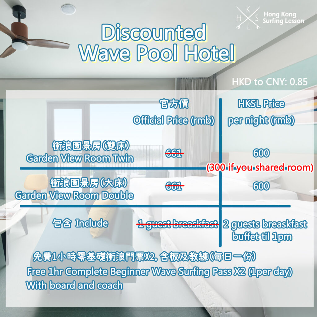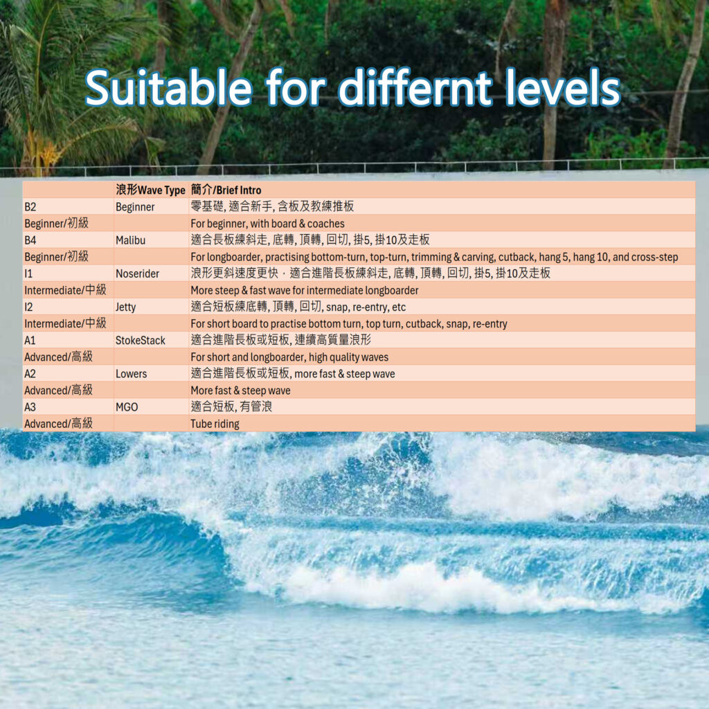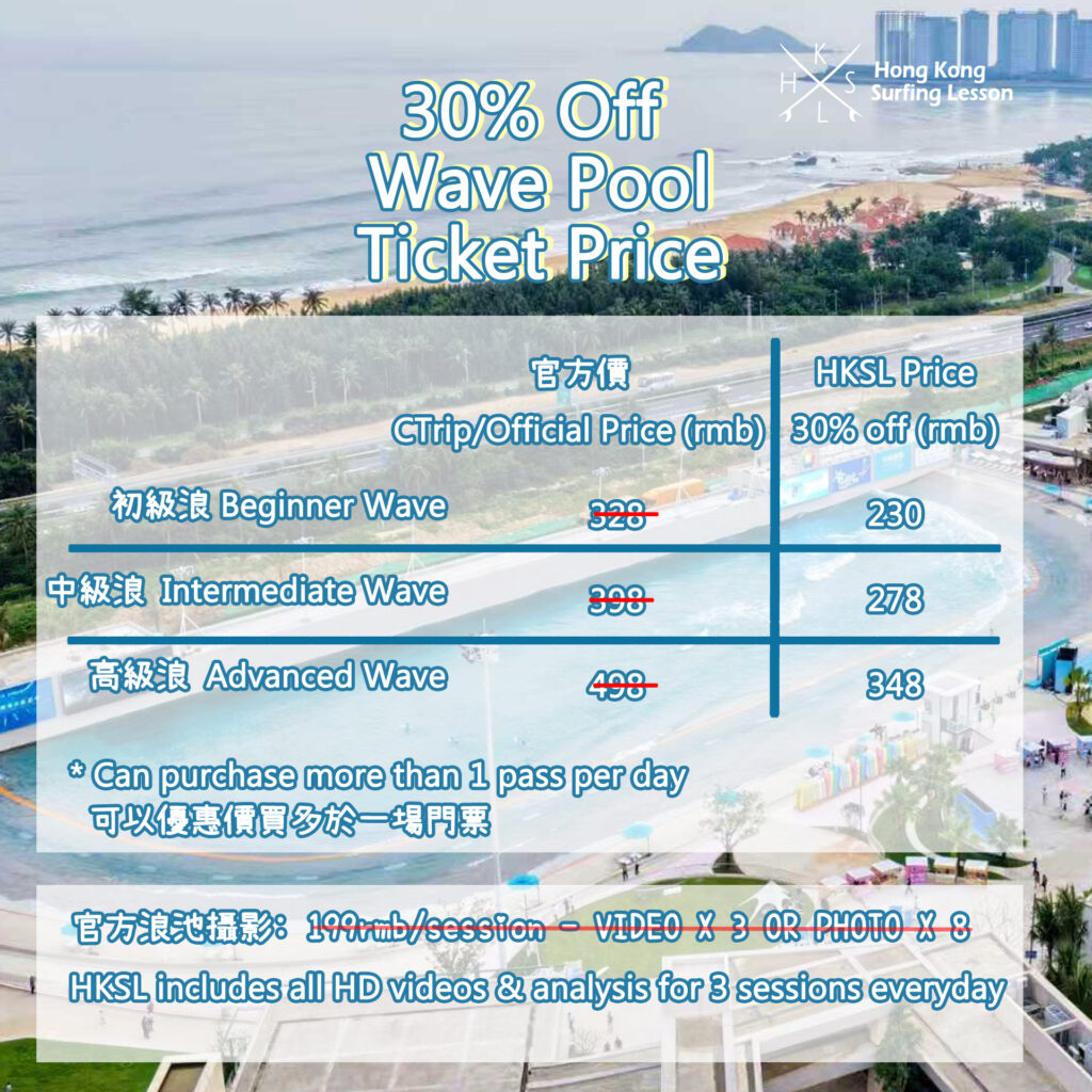 *Surfing Pass: you can choose how many sessions you want to surf daily, if you want to surf 3 intermediate sessions in one day, you can buy three intermediate passes with HKSL price (30% off